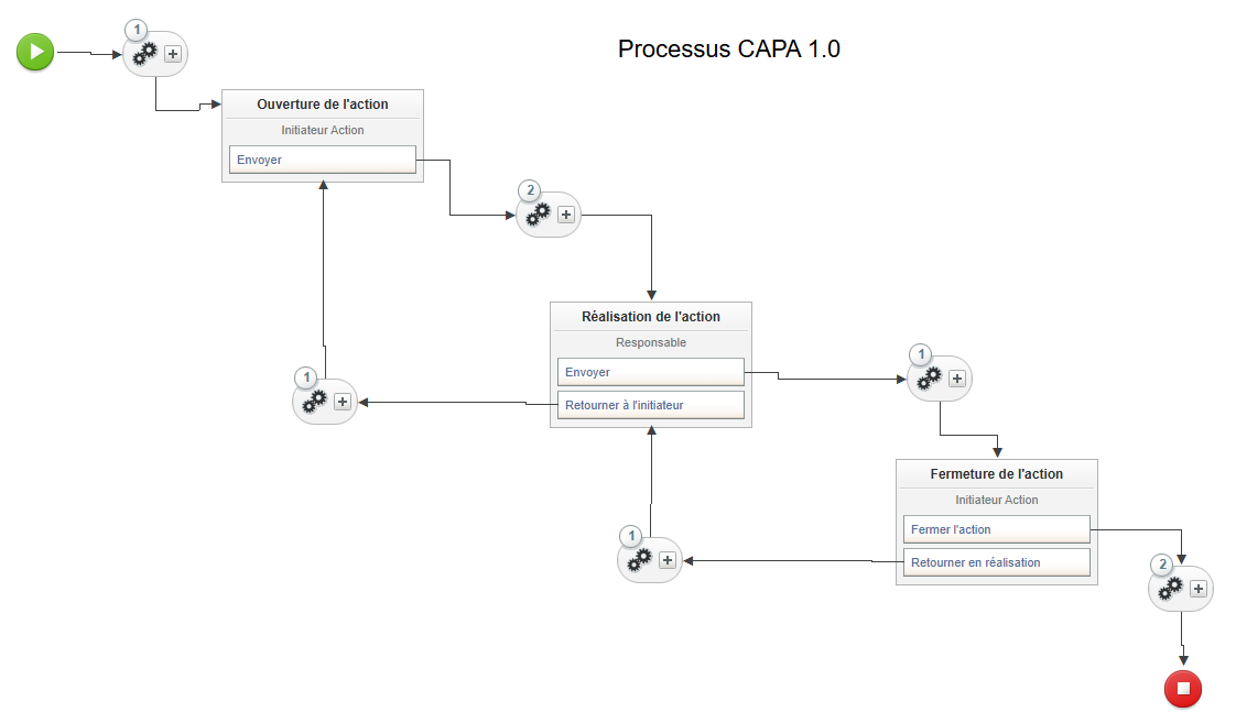 Dans le contexte de la digitalisation dans Visiativ Process, le processus Action est traduit sous forme de flux avec vos étapes, vos formulaires, vos champs.